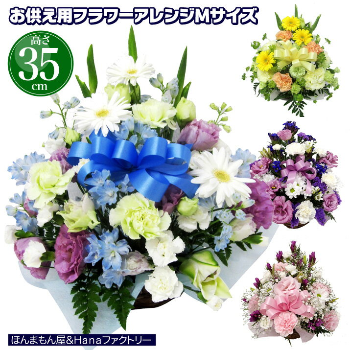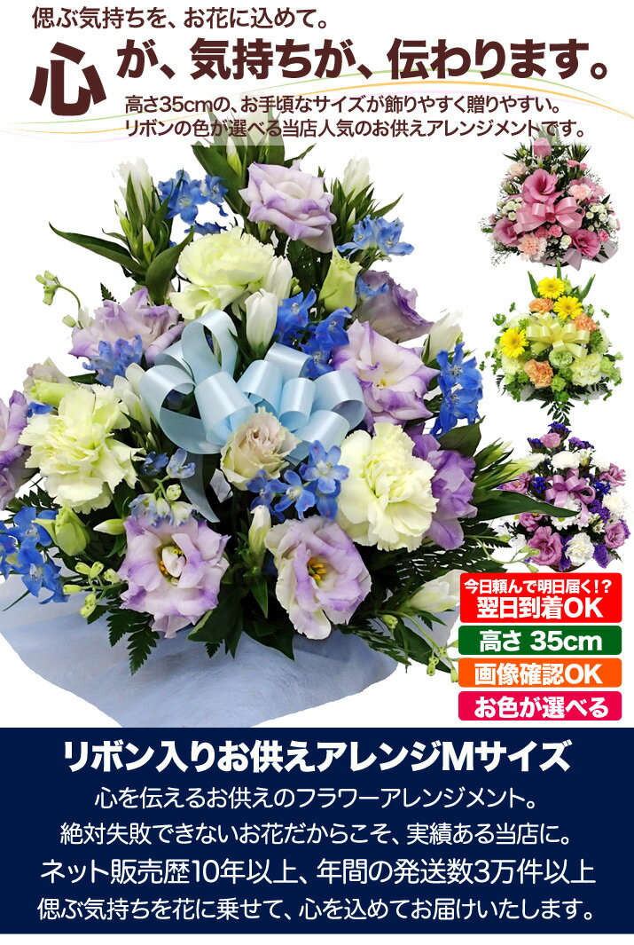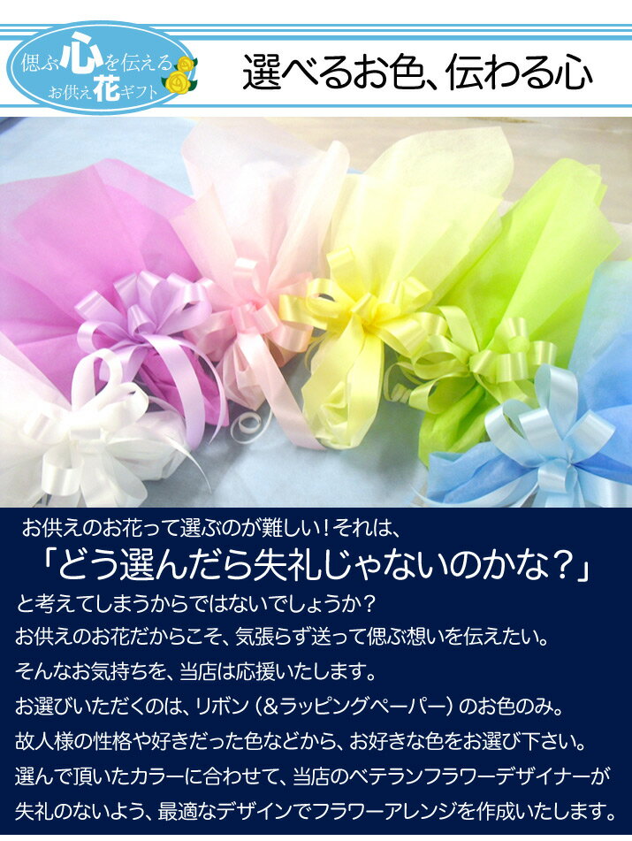 営業日は12時まで当日出荷受付中! お花に厳しい人にもご満足いただけると好評 リボンのお色が選べてお好みに仕上がる、上品なお供えフラワーアレンジメントです