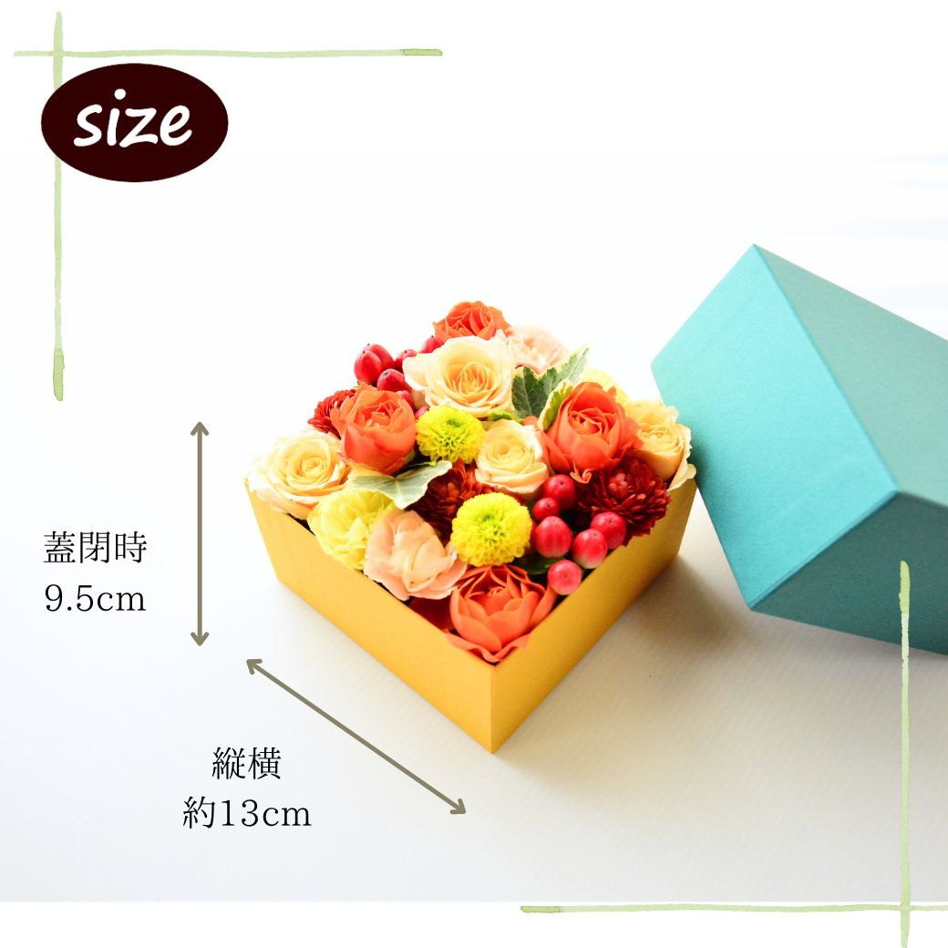 商品説明 使っている花 色合いに応じてお任せ(バラ・カーネーション・マムなど) 実のもの(松ボックリなど) その時に一番良いお花を使わせて頂きます。 サイズ 幅約13.0cm 奥行約13.0cm 高さ約9.5cm(蓋閉時) 幅約12.5cm 奥行約12.5cm 高さ約8.0cm(蓋開時) 注意点 花材はお任せです。雰囲気を合わせて作成いたします。 最短出荷日 14時までの注文で即日出荷致します。 ...