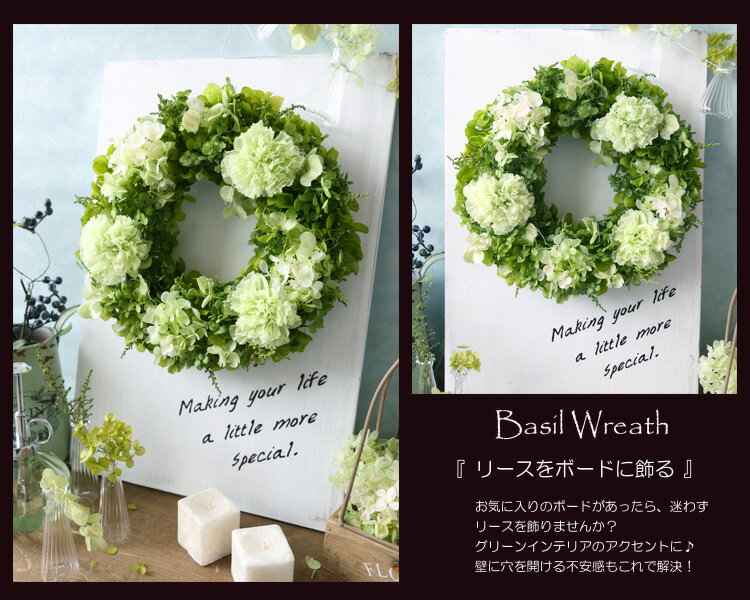 プリザーブドフラワー 壁掛け グリーンを基調とした甘すぎないキュートなリース♪ バジルリース リース 結婚 お祝い