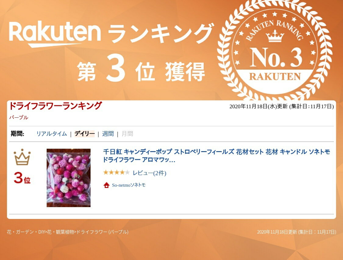 商品説明セット内容ドライフラワー 花材容量目安1パッケージ サイズ パッケージ:約27×20×高さ3cm ※材料の量は写真よりも前後する場合がございます。一つ一つ手作業にてパックにしておりますので、予めご了承ください。 ラッピング本花材キットは、ラッピング・メッセージカード印刷の対象外となります。 納品書等全てのお荷物に納品書、請求書、領収書などの伝票類は同梱しておりません。ご入り用の方は、ご注文...