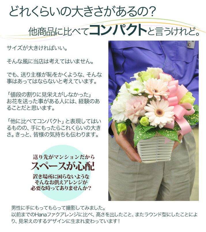 通常、お届けする商品に金額の記載のある書類は一切 お入れしておりません。 プレゼントに安心してご利用頂けます。 ■お届けについてのご注意 配送に2日以上かかる北海道・沖縄・一部地域へのお届けと月曜日のお届けが出来ません。 ※鮮度維持の為にも1日も早く梱包用箱より出して頂きたい為、何卒ご了承ください。 ■おすすめポイント お供え用のアレンジメントです。参考画像と同様にお作...