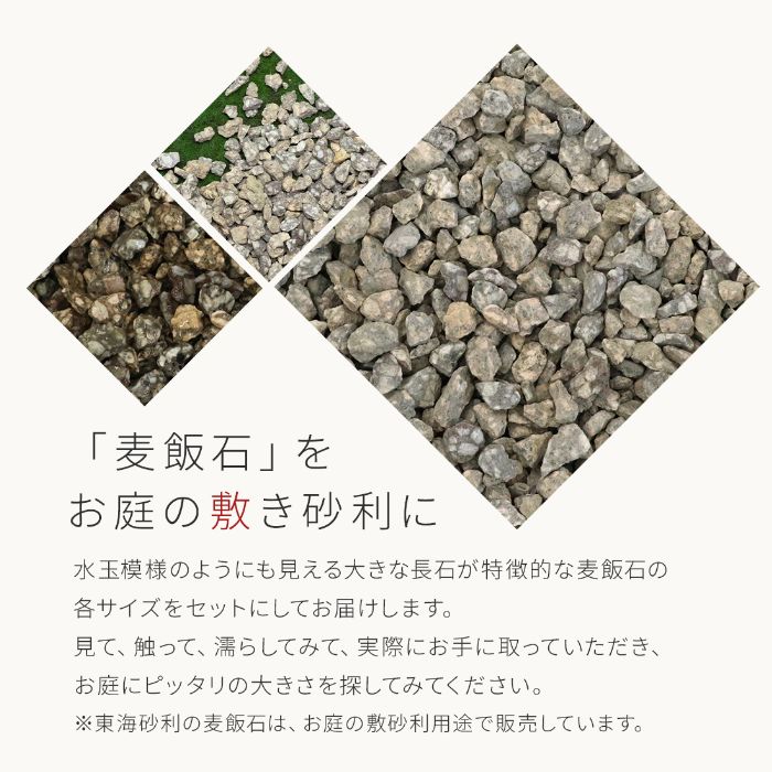 商品の詳細麦飯石 サンプル5種類セット1袋あたり重量約700g袋の大きさ約24×10cm※中身が入っていない状態で計測しています。サンプルについて水玉模様のような大きな長石が特徴的な「麦飯石 (ばくはんせき)」です。東海砂利でお取り扱い中の「2分※」「3分」「5分」「8分」「20-40mm※」をセットにしてお届けいたします。見て、触って、濡らしてみて、実際にお手に取っていただき、お庭にピッタリな大...