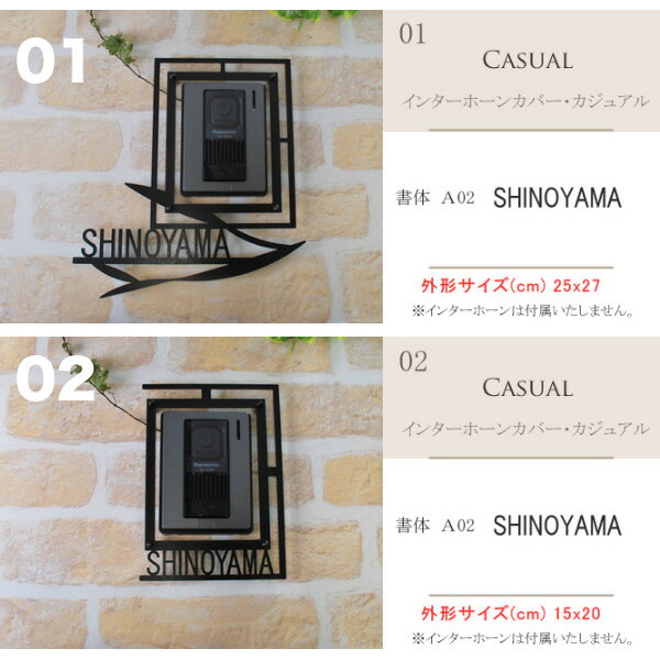 インターホンカバー【カジュアル】 ・材質:ステンレス(SUS304) 2mm厚 ・サイズ:01 幅251mm×H266mm 02 幅148mm×H208mm ※開口部は幅100mm×H140mmです。 ・製作対応書体:A02/B03 ・基本文字数:ローマ字10文字まで ローマ字11文字以上は1文字追加ごとに1,000円+税 (文字数制限あり、製作文字数が多い場合は事前にお問い...