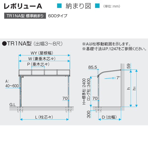 商 品 詳 細 寸 法 屋根幅(WY)7299・奥行(D)1170mm 柱高さ(H)2400・壁固定位置(h)2796mm 柱本数:3本 柱太さ70×70mm 材 質カラー 【材質】 本体:アルミ形材 屋根材:ポリカーボネート板 【カラー】 本体色:ブロンズ・ホワイト・ダークブロンズ・アーバングレー・サンシルバー 屋根材色:ブラウンスモーク・ブルースモーク・かすみ 施工方法 組立式、柱は地中埋込...