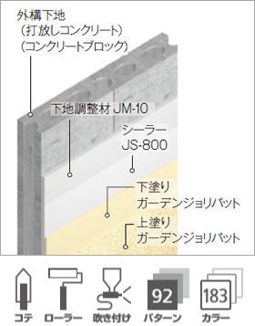 特徴 豊富な表情を持つスタンダードタイプ、内装、外装を問わず使用でき、色やパターンを自由に選べます。 ホルムアルデヒド放散に関し、使用制限を受けない「F☆☆☆☆」に対応しています。 JIS A 6909 内外装薄塗材 Eに適応しています。 柔剛性(硬く、柔らかい性質)があり、この相反する2つの性質が優れた耐久性を生み出します。 防藻・防カビ作用により、長期にわたって繁殖を防ぎます。 塗膜が水になじ...